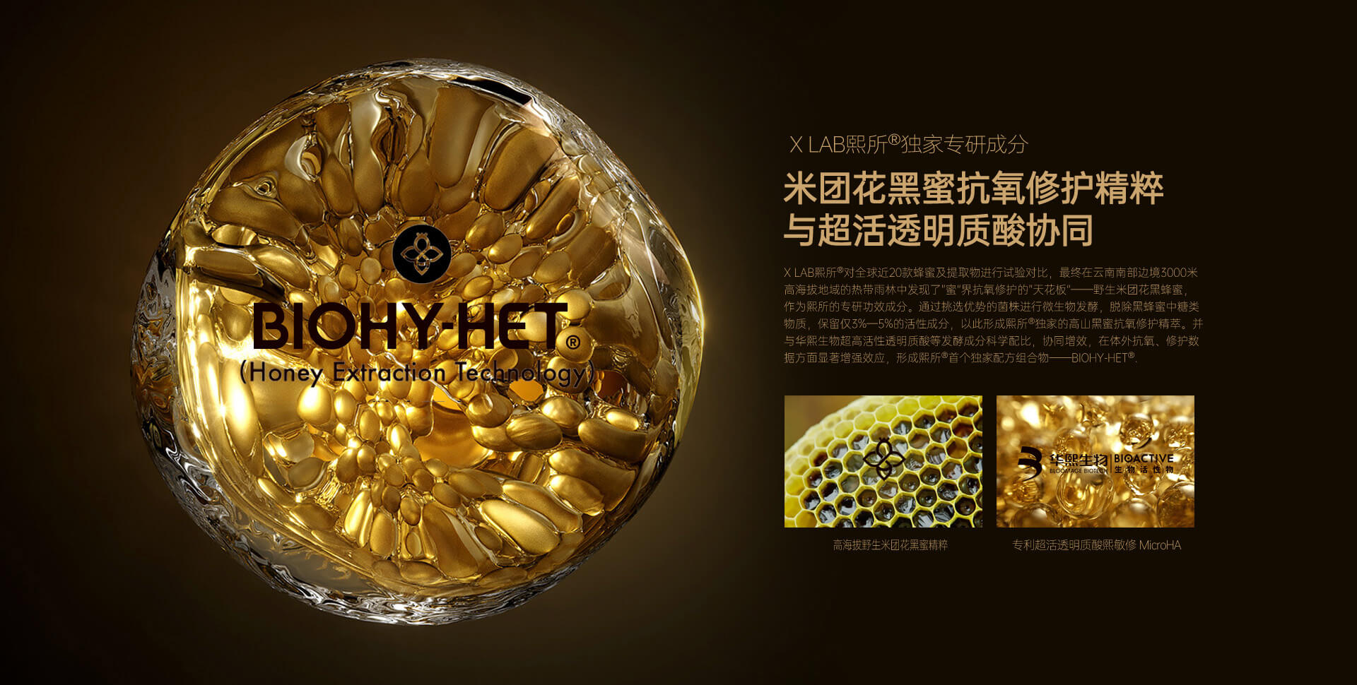 XLAB熙所®: 新一代功效型个人护理品牌。 针对肌肤问题,专研真正有效的功效型个护方案。 依托华熙生物25年研发积累,扎实成分研究和功效数据为基础;独家B1OHY-HET®配方,米团花黑蜂蜜精粹与超活透明质酸科学复配; 微生物发酵活性成分与天然蜂艺高效协同。在抗氧、修护、抗老等方向,开创全新技术路径为问题肌肤带来更安全、更高效的护肤方案。